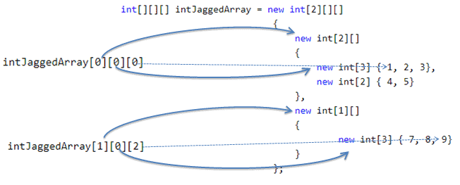 Console.WriteLine(intJaggedArray[0][0][0]); // 1