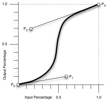 最直接的理解是,將以一條直線放在范圍只有 1 的坐標軸中,并從中間拿出兩個點來拉扯(X 軸的取值區(qū)間是 [0, 1],Y 軸任意),最后形成的曲線就是動畫的速度曲線。