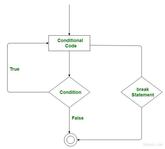 break語句用于終止其所在的循環(huán)或語句。 此后,控件將傳遞到break語句之后出現(xiàn)的語句(如果有)。 如果break語句存在于嵌套循環(huán)中,則它僅終止那些包含break語句的循環(huán)。