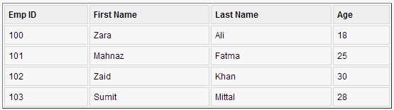 mysql> INSERT INTO Employees VALUES (100, 18, 'Zara', 'Ali'); Query OK, 1 row affected (0.05 sec) mysql> INSERT INTO Employees VALUES (101, 25, 'Mahnaz', 'Fatma'); Query OK, 1 row affected (0.00 sec) mysql> INSERT INTO Employees VALUES (102, 30, 'Zaid', 'Khan'); Query OK, 1 row affected (0.00 sec) mysql> INSERT INTO Employees VALUES (103, 28, 'Sumit', 'Mittal'); Query OK, 1 row affected (0.00 sec) mysql>