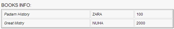 <?xml version="1.0"?> <xsl:stylesheet xmlns:xsl= "http://www.w3.org/1999/XSL/Transform" version="1.0"> <xsl:output method="html" indent="yes"/> <xsl:template match="/"> <html> <body> <xsl:apply-templates/> </body> </html> </xsl:template> <xsl:template match="books"> <table border="1" width="100%"> <xsl:for-each select="book"> <tr> <td> <i><xsl:value-of select="name"/></i> </td> <td> <xsl:value-of select="author"/> </td> <td> <xsl:value-of select="price"/> </td> </tr> </xsl:for-each> </table> </xsl:template>