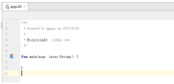 6、在創(chuàng)建了文件以后,需要編寫主程序(main),這是Kotlin應(yīng)用程序的入口點。IntelliJ IDEA提供了一個快速完成此操作的模板。只需鍵入main和按tab鍵就自動完成。