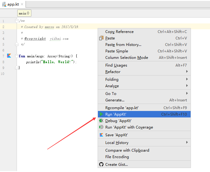 }7、現(xiàn)在我們可以運行應(yīng)用程序。最簡單的方法是點擊Gotlin中的Kotlin圖標(biāo)或在代碼中點擊右鍵,在彈出的選項中選擇【Run’AppKt’】。