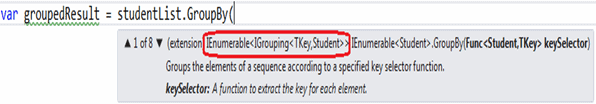 GroupBy運算符的結果是組的集合。例如,GroupBy從Student集合返回IEnumerable <IGrouping <TKey,Student >>: