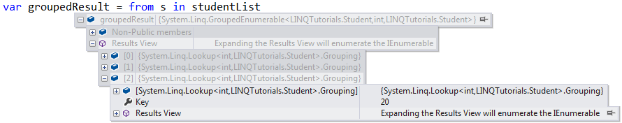 }Dim groupQuery = studentList.GroupBy(Function(s) s.Age)