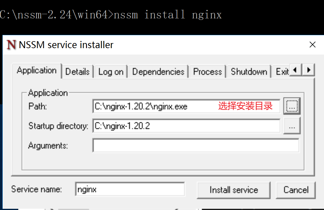 cd C:\nssm-2.24\win64 nssm install nginx