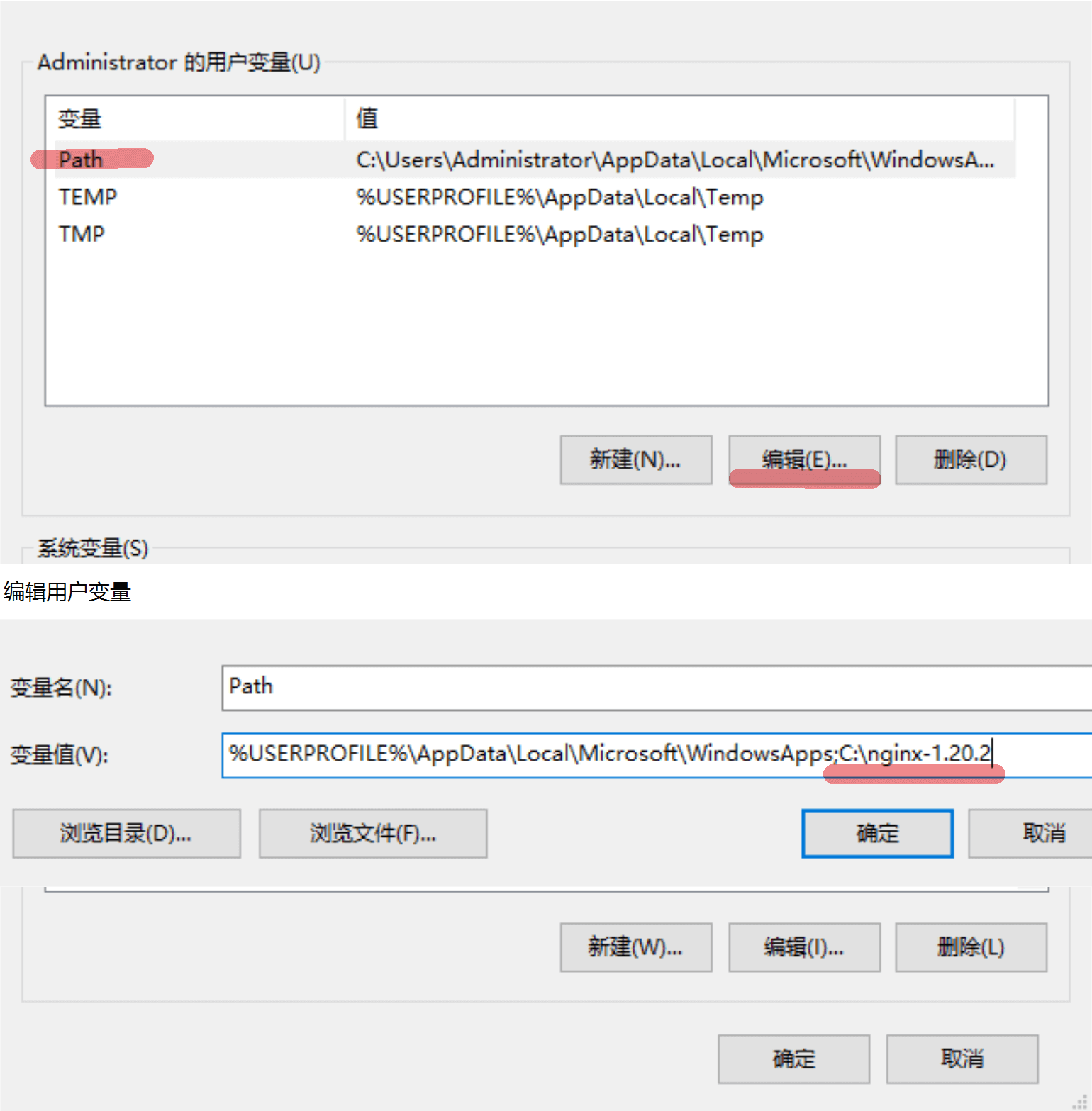 執(zhí)行這些命令之前需要先把 nginx 安裝目錄添加到環(huán)境變量 Path 中,避免找不到路徑,開始右鍵-》系統(tǒng)-》高級系統(tǒng)設置-》環(huán)境變量